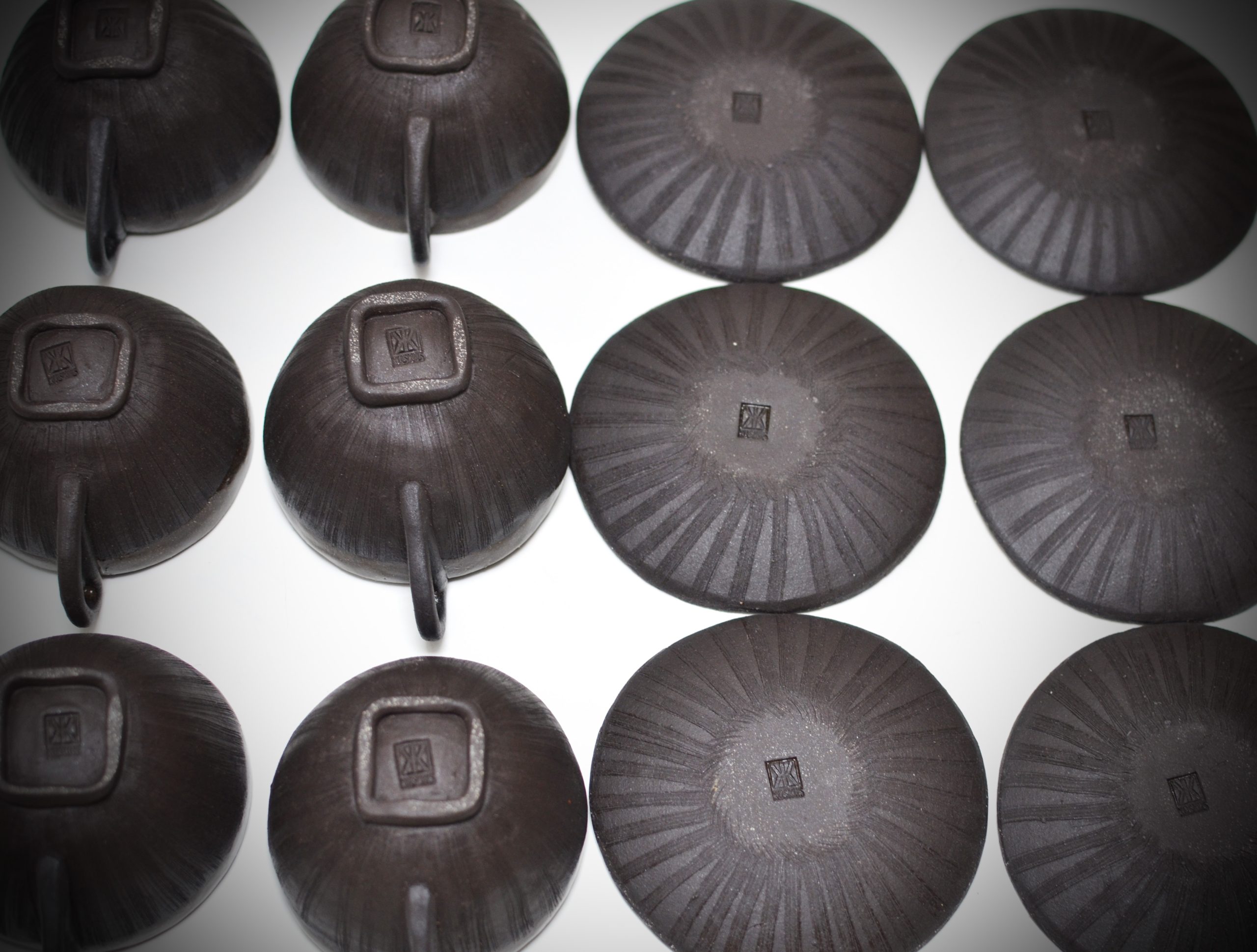 Komplet 6 unikatnih šalčk za kavo ter posodica za piškote. (ročno izdelano, črna glina kamenina) Vsi izdelki v spletni trgovini so ročno delo. Glazure so varne zato predmete lahko uporabljate za serviranje hrane. Vsi izdelki se lahko operejo v pomivalnem stroju, vendar priporočamo ročno pomivanje. Every item in this online shop is entirely handmade. This item is glazed with non-toxic materials, making it food safe. It can be washed in a dishwasher but careful hand washing is recommended.